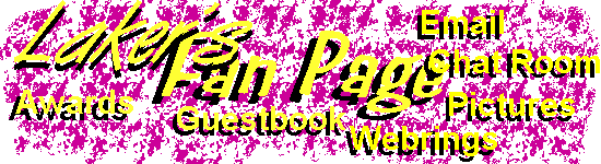 Welcome to the Lakers Fan Page! Thanks for coming! This web site is always under construction. I am always adding things to make it the best Lakers website on the web! But, in order for me to make this webpage better, I need comments and suggestions from you. I have just created a Survey Page so you can give me your comments and suggestions! Go there by clicking on the link. E-mail me them at [email protected]. Also, if you would like me to place a link to your webpage on this site (please, only Lakers, NBA, and basketball sites only), please E-mail me the site address, and a banner address if you want me to place a banner for your page on mine. Click here to go to my new and easier to use Lakers Chat Room! You need a JAVA enabled browser though. Go to my Lakers Picture Page by clicking on the link. Or come see all the webrings I am in at my Webrings Page. This page has won some awards. Please visit my Awards Page to see them. This page is now giving away awards to the best websites out there. You can submit any type of website, as long as it is yours. It does not have to do with the Lakers, the NBA, or even basketball. You can register to win the awards by going to the Win My Award Page! Also, check out this page to see Who Has Won My Awards. Check out my Lakers Trvia Page by clicking on the link. I will be adding more to it soon. I'm happy to say that my Fantasy Basketball League is now full and we can start the season soon because the lockout is over! You can go to the league's homepage by clicking on the link. Please vote for my website on the basketball Top 100 by clicking on the link. Also, please vote for my site on the Top 100 Laker Sites by clicking on the link. I hope you enjoy your visit to this page! The Lakers have been playing great with the new addition of Dennis Rodman and new coach Kurt Rambis. They are 7-0 with both of them, and on a 7 game winning streak hoping to make it 9 when they face the Clippers again at the Forum. Rodman must have been the missing link because with him the Lakers have defeated the Houston Rockets, Seattle Supersonics, and their nemesis Utah Jazz. You have heard all the rumors, but today its official, the Lakers traded All-Star Eddie Jones and backup PF/C Elden Campbell to the Charlotte Hornets for All-Star Forward and sharp-shooter Glen Rice, guard B.J. Armstong, and forward J.R. Reid. Rice is just healing from elbow surgery on his shooting arm. Will this be a bad trade because Rice is a worst shooter?